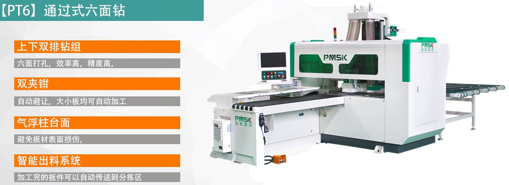 PT6通過式六面鉆是品脈數(shù)控自主研發(fā)設(shè)計的一款高端板式家具數(shù)控排孔設(shè)備,通過無線掃碼(帶排序功能),自動定位,雙夾鉗自動夾板,自動載入加工,一次實現(xiàn)六面孔位加工和正反面槽加工,加工完成后夾鉗自動將板件載入分揀回轉(zhuǎn)平臺,加工效率高,自動化程度高,是目前高端板式家具生產(chǎn)連線主要的排孔設(shè)備。